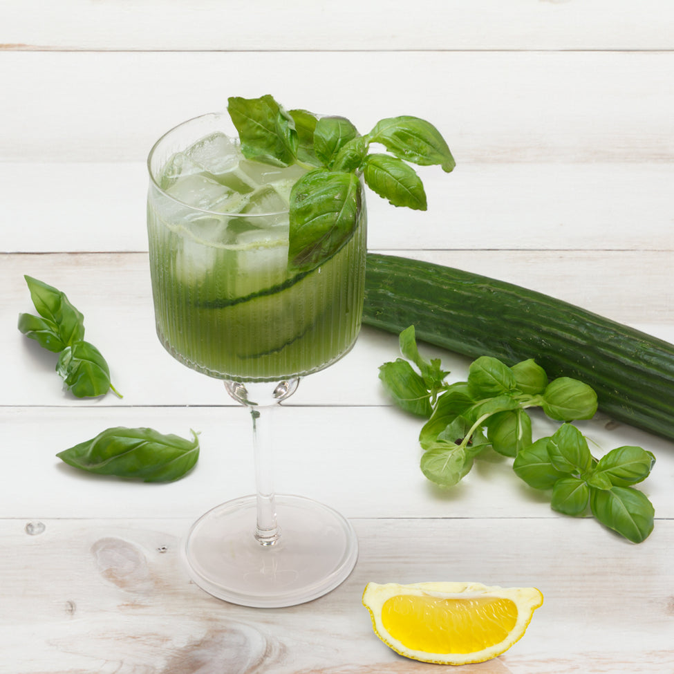 2 cl Gurkensirup | 2 cl Gin (optional) | 6 cl XZENS Basil/Lemon Pepper | 6 cl Sprudel Wasser | 8 cl Prosecco | Eis