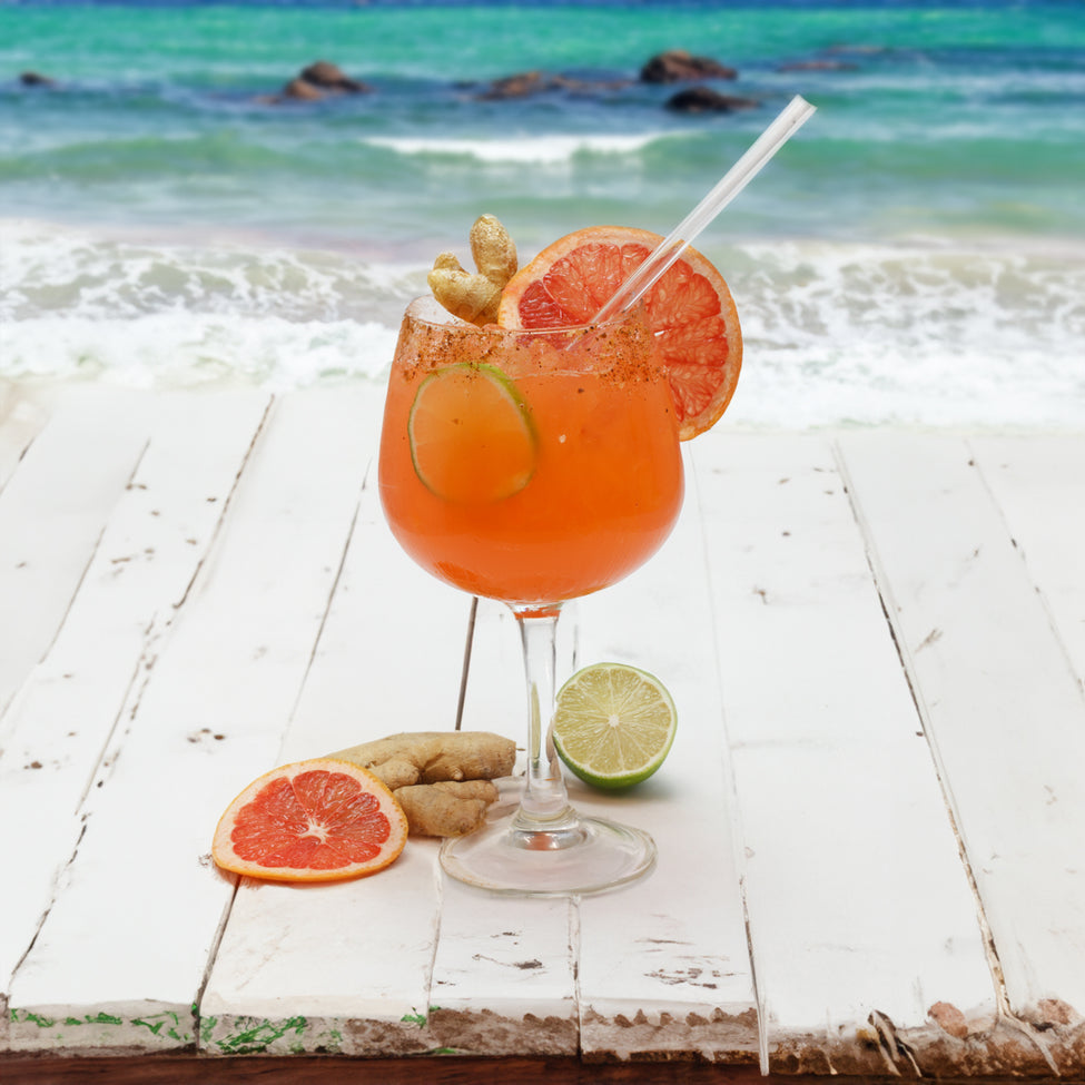 4 cl Kokusnusslikör (Batida de Coco) | 6 cl XZENS Spicy Ginger / Grapefruit | 6 cl Wasser | 8 cl Weißwein (trocken) | Eis [Im Shaker mit Eis gut schütteln]